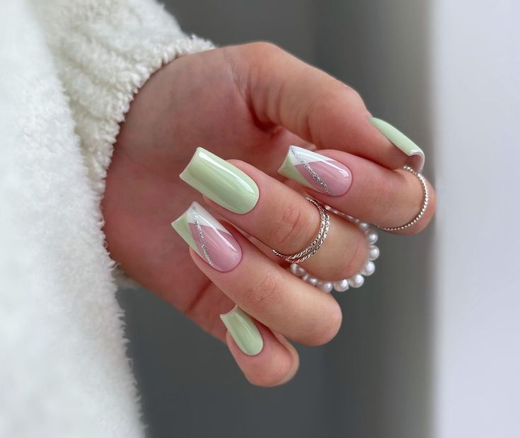 Fresh and elegant, these green French tips are elevated with sparkling silver details. The pastel green hue is a perfect nod to spring, while the delicate glitter adds a touch of glamor. This 2025 trend works well with longer square or coffin nail shapes, creating a clean and modern aesthetic.