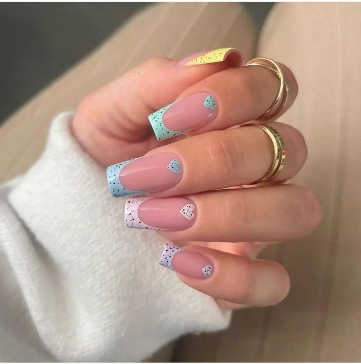 Playful yet sophisticated, this multi-colored design features yellow, blue, and lavender tips with tiny heart-shaped accents. The polka dot details on each tip bring a fresh and youthful energy, ideal for women who love creative nail design. Best suited for square nails, this style celebrates the fun spirit of spring.