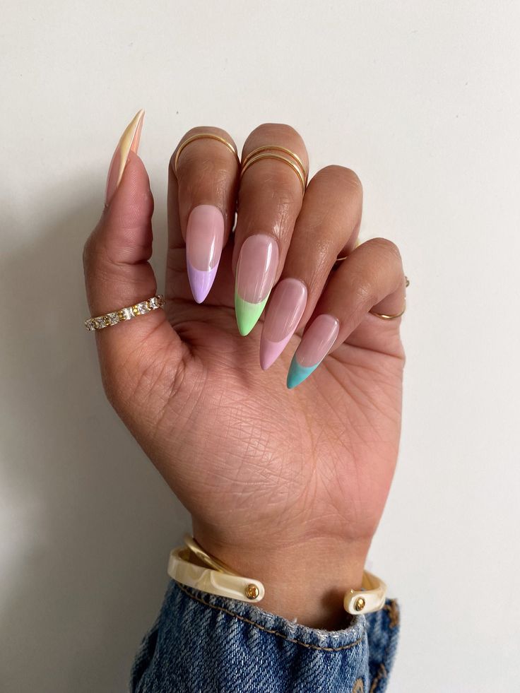 Bring a playful edge to your spring French tip nails with this vibrant multi-colored design. Featuring bright hues like orange, pink, blue, and green, these almond-shaped nails radiate joy. The minimal base allows the colorful tips to pop, creating a fresh and modern aesthetic. This design is perfect for fashion enthusiasts looking to make a bold statement in 2025 trends.