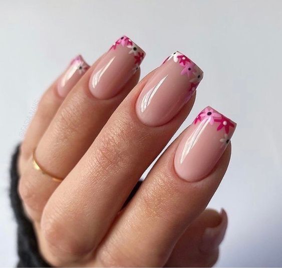 This soft and romantic design highlights flowers in vibrant pink hues along the edges of square nails. The floral accents are playful yet refined, capturing the essence of blooming spring gardens. Perfect for shorter lengths, this design is both fresh and versatile.