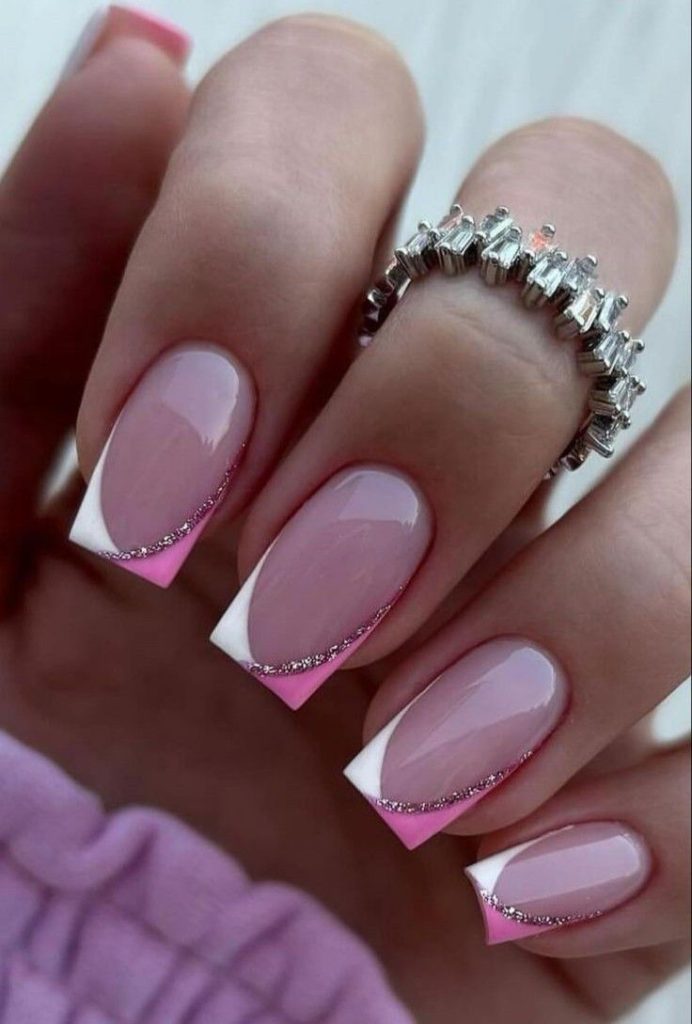 Add a touch of glamour with this unique twist on pink French tips. The subtle pink base is paired with white edges and a fine line of glitter, creating a stunning curve that flatters the nail shape. This elegant design works beautifully on coffin or longer oval nails, giving them a sleek and sophisticated finish. The soft pink hue evokes a romantic and timeless vibe, perfect for both casual and formal spring occasions.