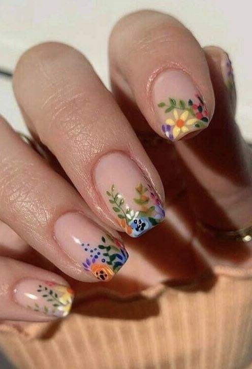 These nails feature a lively mix of flowers in yellow, purple, and orange hues, resembling a blooming spring garden. The detailed floral artwork on square nails is perfect for those who love bold and artistic designs.