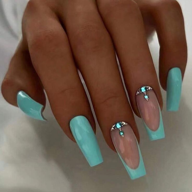 Make a statement with these bold blue French tips featuring rhinestone embellishments. Perfect for coffin nails, the aqua blue hue adds a striking, luxurious edge.