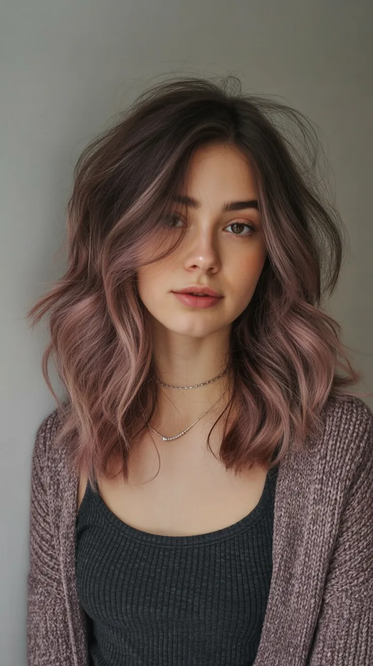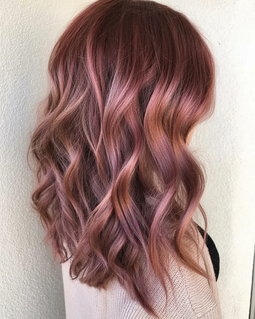 15. Muted Rose Balayage on Soft Waves