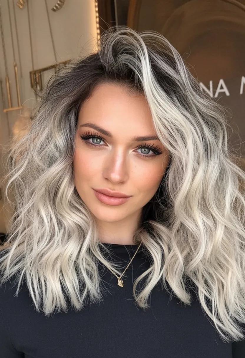 This look has that instantly striking, modern elegance that feels powerful without being flashy. The contrast between the cool platinum lengths and the smoky darker roots creates depth and attitude, while the loose waves keep everything soft and wearable. It’s confident, polished, and a little bit daring—perfect for spring when you want your hair to feel fresh, elevated, and unmistakably current.