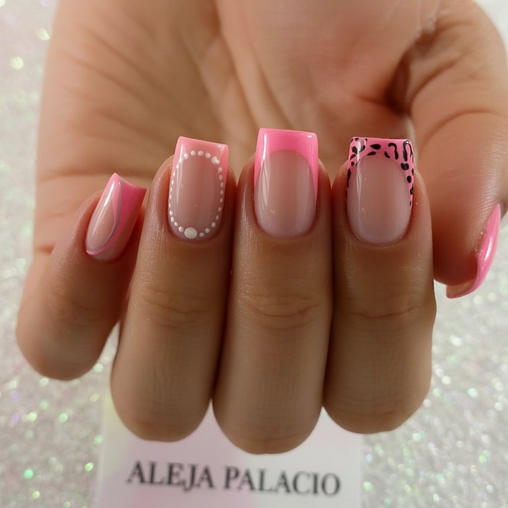 Playful pink French tips, dainty dot borders, and a touch of leopard create a flirty set that’s equal parts sweet and stylish. The clear negative space keeps it airy, while the square tips bring structure. It’s an easy mood lifter—cute, upbeat, and perfect for ideas for summer trips or weekend plans.