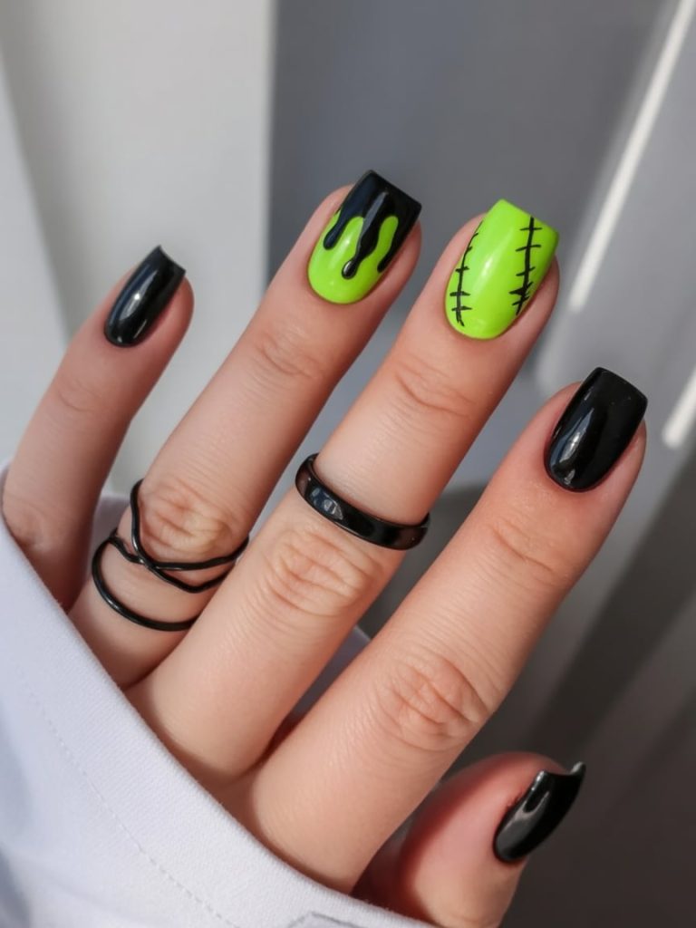 2. Black & Green Drip Square Nails