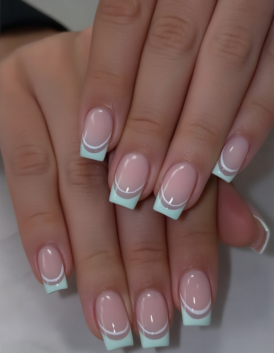 Comparison with other cuts: compared to a classic white French mint, this feels lighter and more playful without losing any polish. For this, ask your tech for short square nails to keep the arcs crisp and polished. The tech can paint the fine inner line with a striping brush and a high-gloss topcoat to emphasize the arcs and polish.