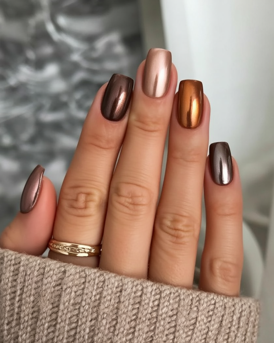 Soft copper, burnished brown, and deep espresso are the colors that form a wardrobe of stunning molten metals that shift across square nails. It is a stunning modern chrome layer that is also cozy, perfect for autumn luxury. Warm, dimensional, and modern, it is autumn luxury bottled into a mani.