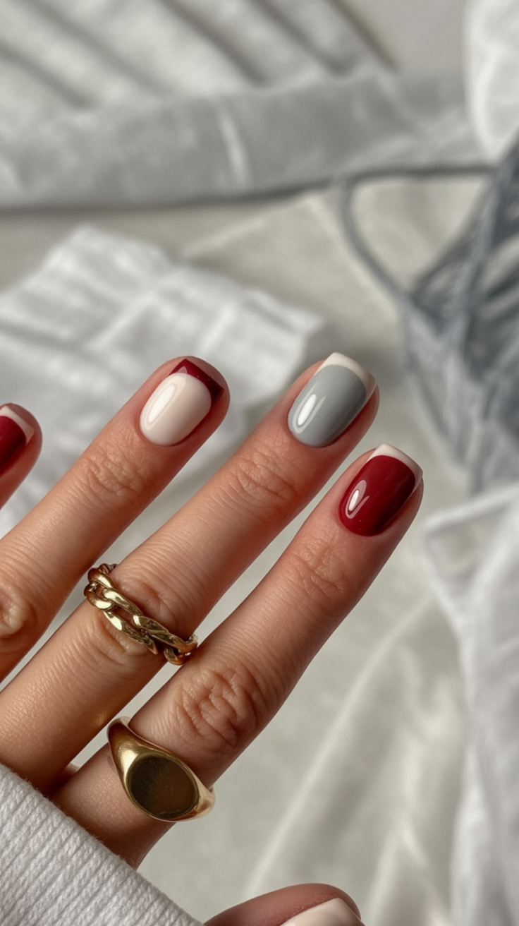 Think knit sweaters and latte walks: deep red, cloud gray, and cream rotate across short squares with micro French highlights. The palette feels calm and intentional, and the compact length keeps everything neat—perfect for busy weeks when you want zero fuss. It’s inspiration for matching your mani to a capsule wardrobe without going monochrome.