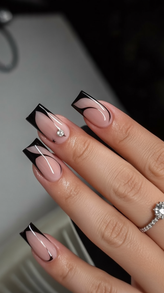 A sculpted black French sweeps across nude squares, finished with a single crystal that catches the light like jewelry. It’s sleek, modern, and just dramatic enough for a night out. The high shine and curved lines flatter the square edge, adding movement without clutter—a confident choice that still reads refined.