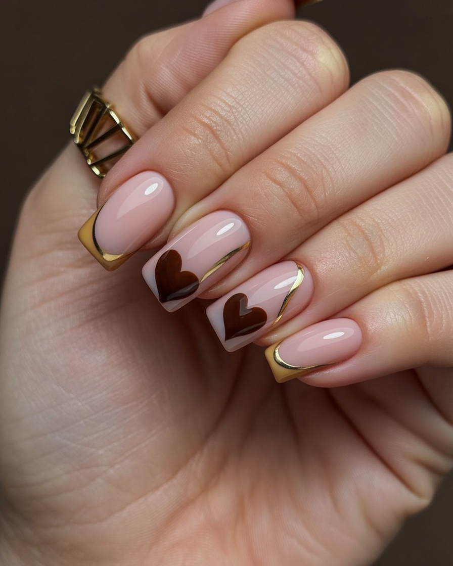 Romance, but make it sculptural: glossy nude squares with molten-gold French edges and chocolate hearts nestled on a couple of nails. The metallic tracing adds glow, while the hearts keep it sweet, not saccharine. It’s perfect for anniversaries, date nights, or whenever you want a little extra charm.
