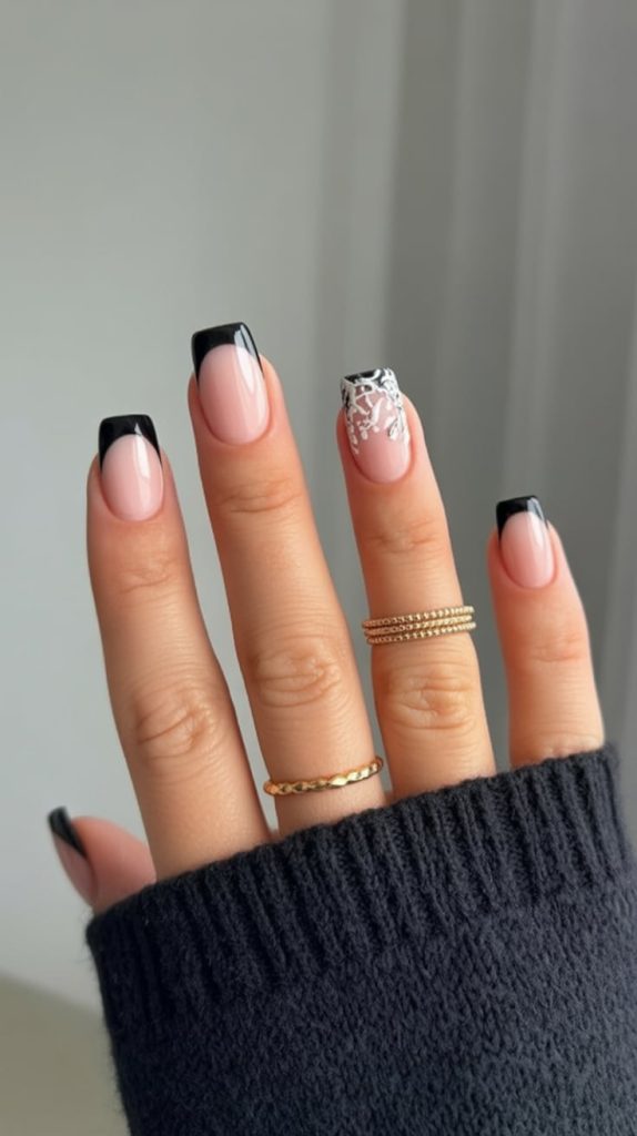 Chic and moody, this set combines inky black French tips with a single lace-detailed accent. The mix of solid drama and delicate pattern feels grown-up and elegant—perfect for dinners, date nights, or simply elevating your sweater-and-jeans days. The square silhouette keeps it clean and wearable.