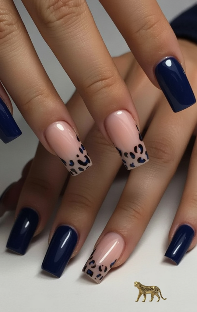 Deep navy squares set the stage for chic French tip accents dotted with blue-and-black leopard spots. The mix of sleek solid color and playful pattern is city-sophisticate meets safari—balanced, confident, and a little unexpected. It’s an easy way to nod to print without committing to full-on animal across every nail.