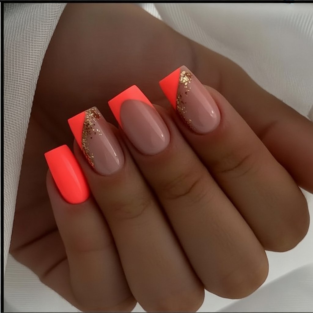 Turn the volume up with neon coral blocks and French tip slants laced in soft gold glitter. The squared shape reins in the brightness so the look stays wearable—think vacation sunset bottled on your fingertips. It’s bold, joyful, and guaranteed to earn compliments from summer through Christmas party season.