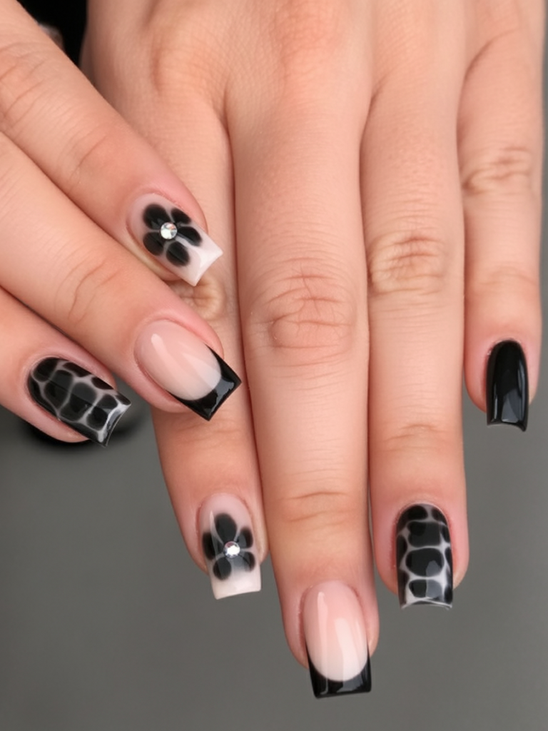 Black and ivory squares harmonize with a single-petal flower, tortoise-inspired art, and glossy French edge tips. It is a collection of neutrals on one hand—cohesive, modern, and slightly mysterious. Each bloom’s center is formed with a rhinestone, which draws the eye just enough to catch attention without overwhelming the overall design.