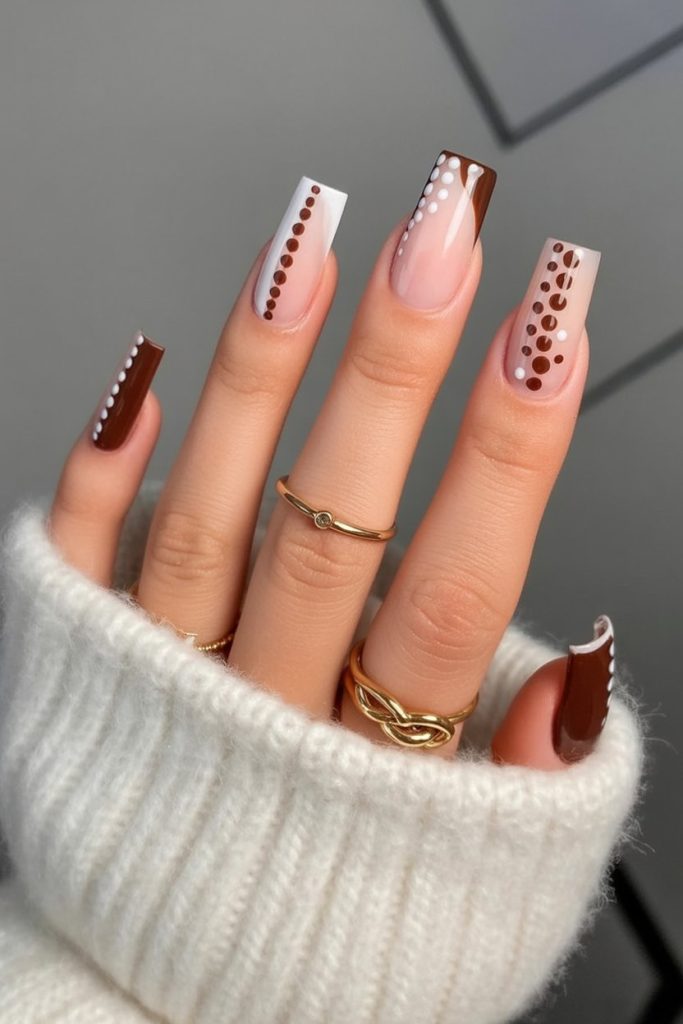 Minimal yet playful, this design pairs brown mocha blocks with white diagonals and neat dot trails. The composition is graphic without shouting—perfect for autumn 2026 wardrobes full of camel coats and cream knits. The square silhouette keeps everything crisp so the dots look intentional, almost jewelry-like along the edges.