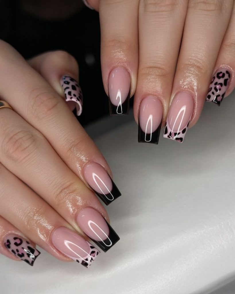 3. Black French Tip with Pink Leopard Accents