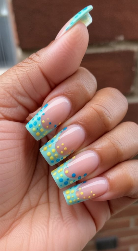 Breezy and joyful, these sky blue French tip squares dance with dotted arcs in yellow and teal—like confetti on vacation. The sheer pink base keeps everything airy, while the geometric curves feel fresh and graphic. It’s pure summer happiness on your fingertips, perfect with white sundresses or a striped tee. The square shape adds polish so the playful design still reads as refined.