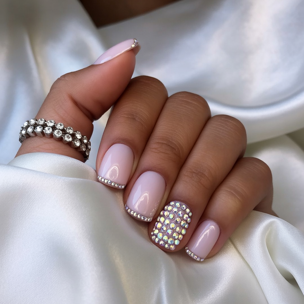 Delicate blush squares get a couture lift from tiny crystals tracing the cuticle—and a fully jeweled accent for extra sparkle. The result is bridal-level elegance that still reads as everyday pretty. It’s soft, feminine, and utterly luminous under evening lights, giving instant inspo for holiday parties or a dressed-up brunch.