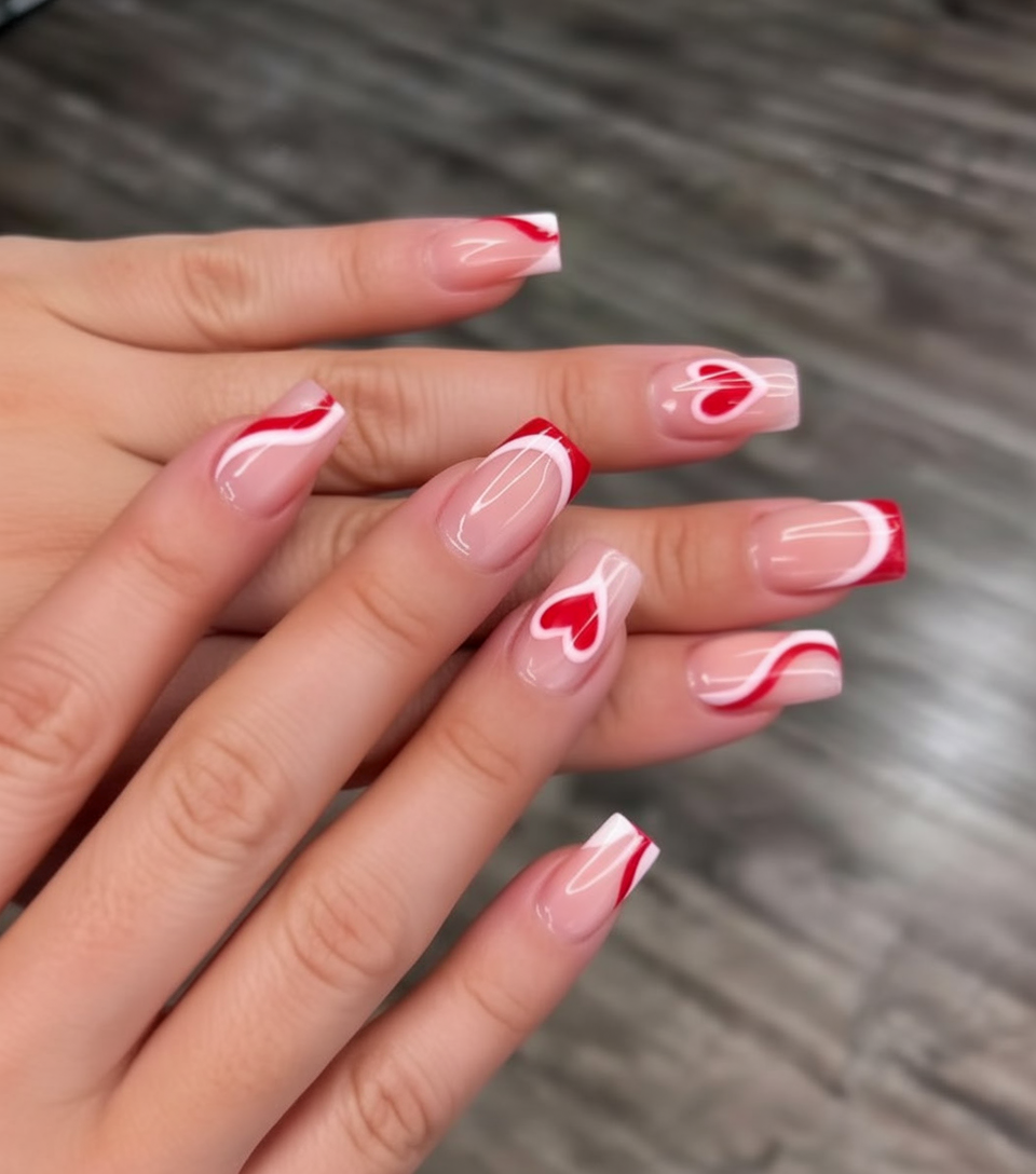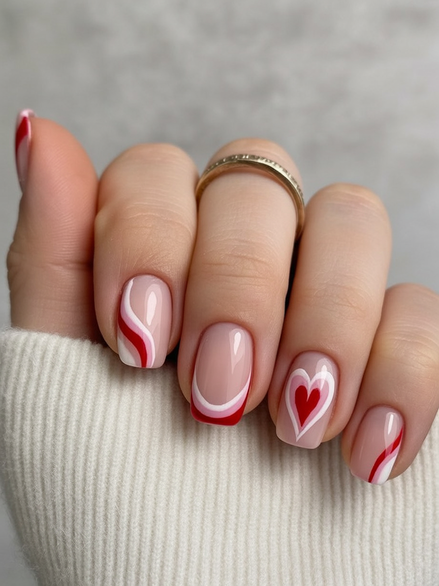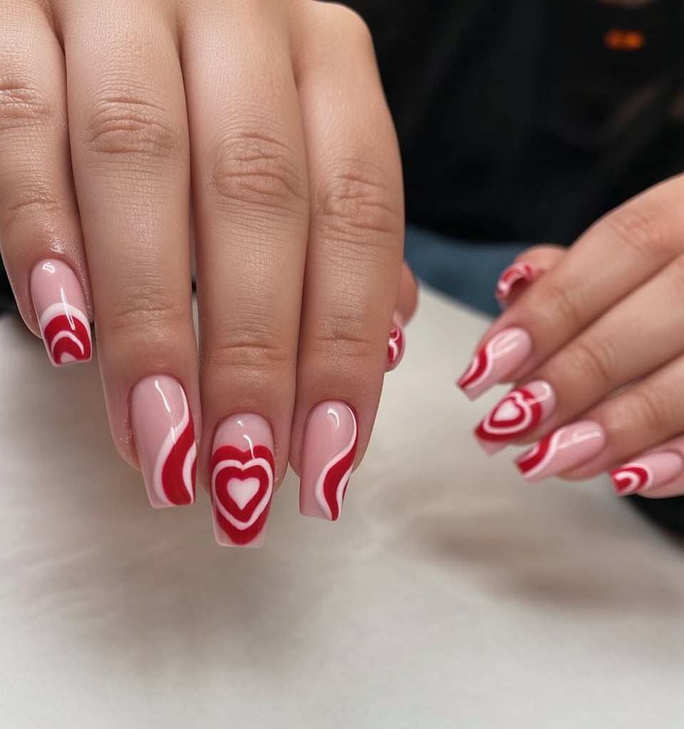 These short square nails feel like a cozy Valentine’s sweater in manicure form. The nude base is soft and comfortable, while red and white waves wrap around a few nails like little ribbons. The center of the look is that layered heart on the ring finger, framed in white and red so it really pops. Everything about this set feels approachable and cute, the kind of design you’ll want to keep staring at while you sip your latte.