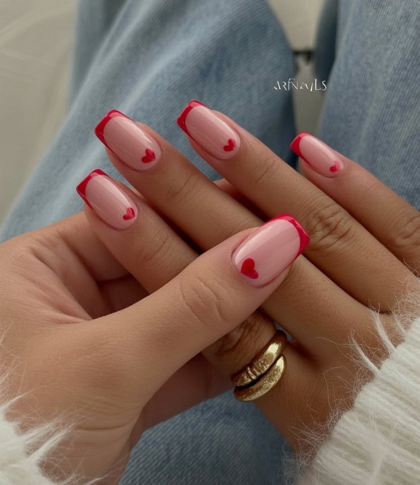 These short square nails capture that “effortless but thoughtful” Valentine’s energy. A milky pink base keeps the manicure soft, while slim red French tips add a little pop of color. The real charm is in the mini hearts tucked near the cuticles—just one on each nail, like a quiet little secret. It’s dainty, cute, and subtle enough to wear long after February 14 has passed.