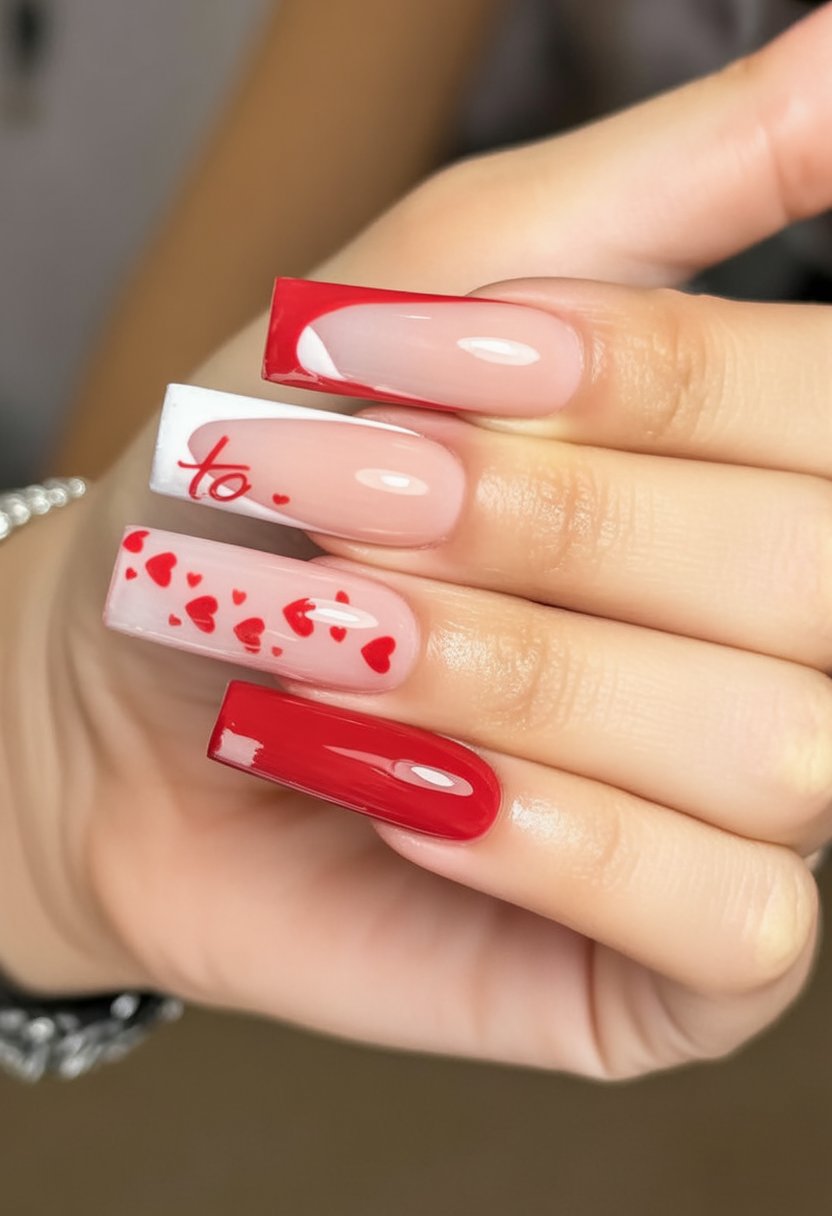 These long square nails are reminiscent of a tiny love letter wrapped around your fingers. With a sheer blush base, things stay soft, while striking blocks of red at the tips and scattered hearts tell a romantic tale across the hand. One nail even has elegant handwriting-style lettering—just like a note signed for you. It’s feminine, a little dramatic, and quite obviously made for anyone who wants their Valentine’s look to be remembered.
