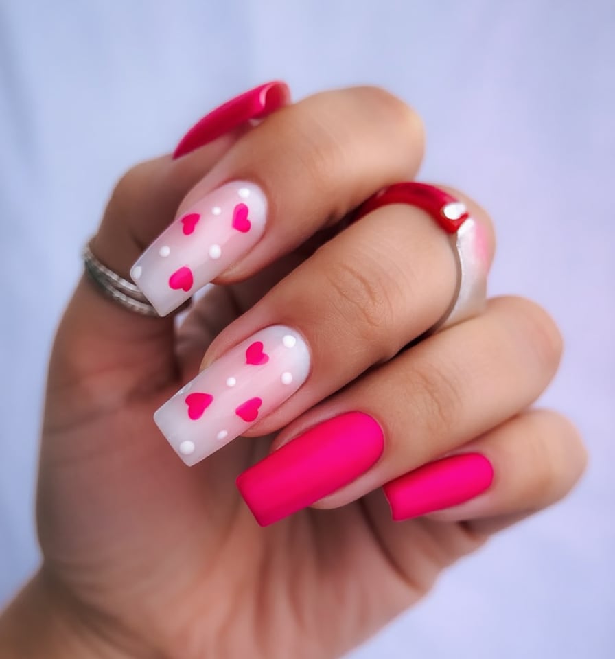 These long square nails look like a Valentine’s party in manicure form. Two nails are drenched in bold hot pink for that instant mood boost, while the others are frosted with a milky base sprinkled in tiny heart confetti and white dots. The mix of matte and soft-focus finishes makes the pink hearts pop even more, turning your hands into the cutest little celebration every time you reach for your coffee.