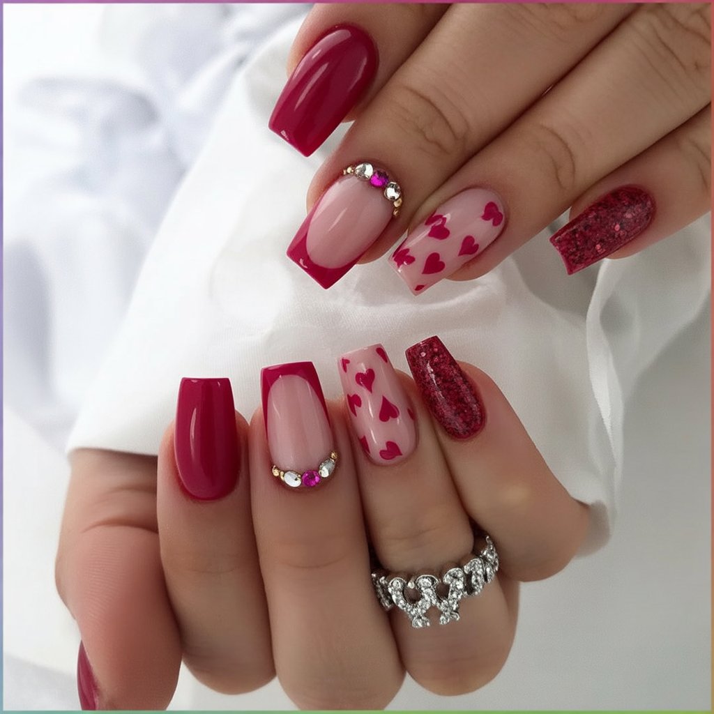These square Valentine’s nails are pure fun—like candy, gemstones, and confetti all rolled into one set. Hot pink blocks of color sit next to sheer nails covered in tiny hearts, while glittery red squares catch every bit of light. A couple of nails are topped with crystal arcs at the cuticle, turning them into little pieces of jewelry. The whole look feels playful and glamorous, perfect if you want your manicure to be the main accessory.