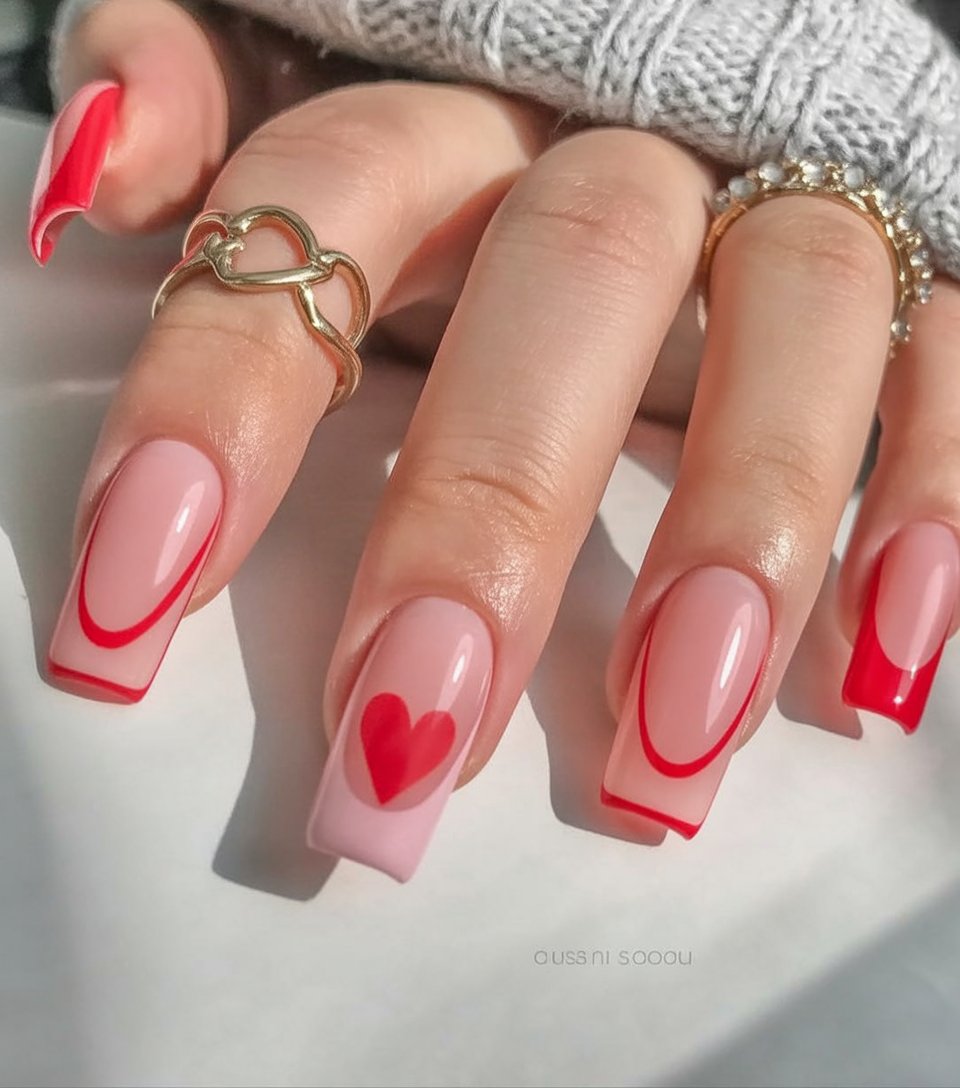 If you usually go for chrome nails or more elaborate designs, this set is a beautiful reminder that minimalist details can be just as striking. The clean lines emphasize the square shape and make your fingers look longer, while the limited palette of pink and red stays timeless. It’s a great option when you want something classy enough for the office but romantic enough for Valentine’s dinner right after.