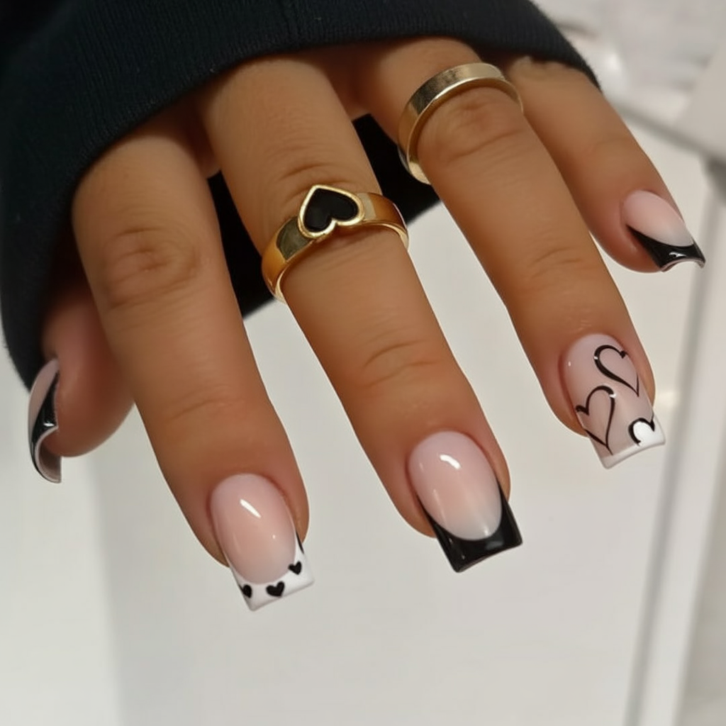 If you’re not a pink and red kind of girl, these black and white square pink nails are the chicest Valentine’s option. A transparent blush base means softer is sexier, though the sharp black French tips and little hearts at the edges add a Goth twist. One nail is left largely white with sketched hearts, as if it’s a doodle in the corner of a notebook. The contrast gives the whole set a modern edge, just right for anyone whose romance skews more Gothic than sweet.