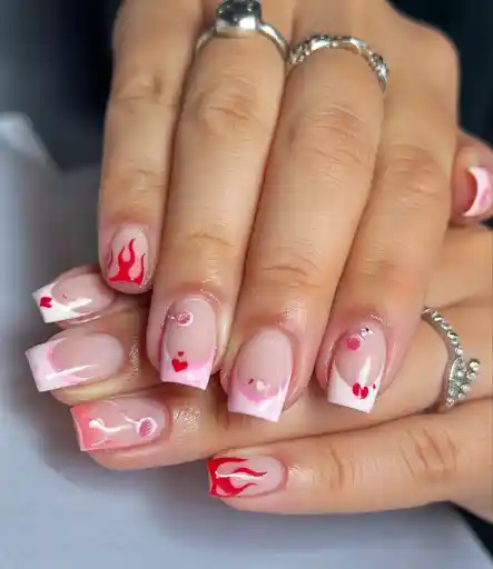 8. Flaming hearts french tips on short square nails