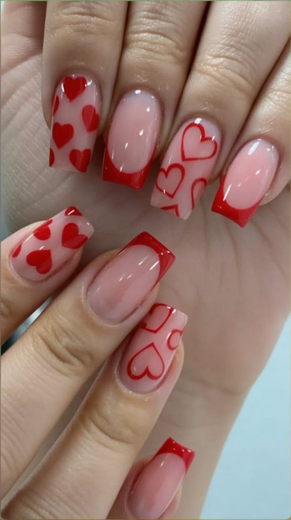 There’s nothing shy about these square Valentine’s nails. A sheer neutral base keeps the look clean, but the red hearts and matching tips do all the flirting for you. Some nails are covered in full heart patterns, others get airy outlines, and a few stay mostly bare with just that sharp red edge. The mix of coverage makes your hands look like a collage of love notes, bold without feeling messy.
