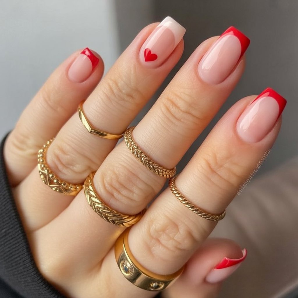 Short square Valentine’s nails, which are a whisper of romance. A see-through nude base keeps everything soft and neutral, while sharp red French tips border the nails with just enough color to feel festive. The small single heart on your ring finger makes for the sweetest little accent nail moment, a note of love that’s just between you and yourself. With the gold jewelry, it feels elevated, classy, and still totally doable for a Tuesday at the office or a Saturday night date.