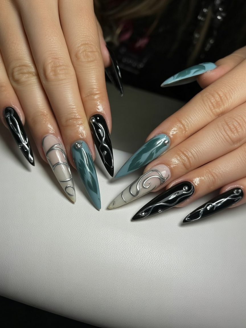 Moody teal meets glossy black with flowing metallic lines that look poured on. The mix of negative space, mirror swirls, and pinpoint studs gives futuristic drama—part night sky, part art deco. It’s elegant yet goth-adjacent, making it perfect for anyone who loves designs that toe the line between edgy and refined. The long taper keeps every movement mesmerizing.
