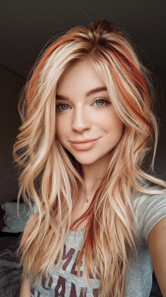 Blending buttery blonde with rust-toned streaks, this look makes a strong case for embracing unexpected contrasts in colors 2025. It’s sun-kissed with an edge, merging warmth and coolness in one flowing style. Perfect for spring, it channels beach vibes while keeping a strong fashion-forward presence.