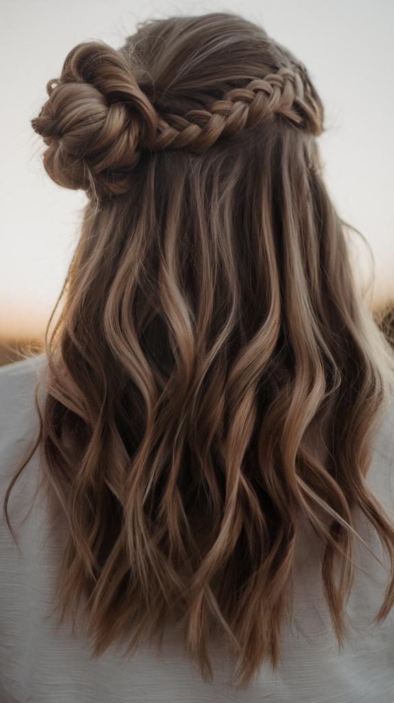 Easy-going but impactful, this half-updo features a twisted knot paired with a single crown braid, falling into tousled waves. The Brunette base feels soft and natural, embracing the lived-in texture trend that’s so key for spring 2025. It’s part whimsical, part effortless—perfect for a picnic date or a golden-hour stroll.