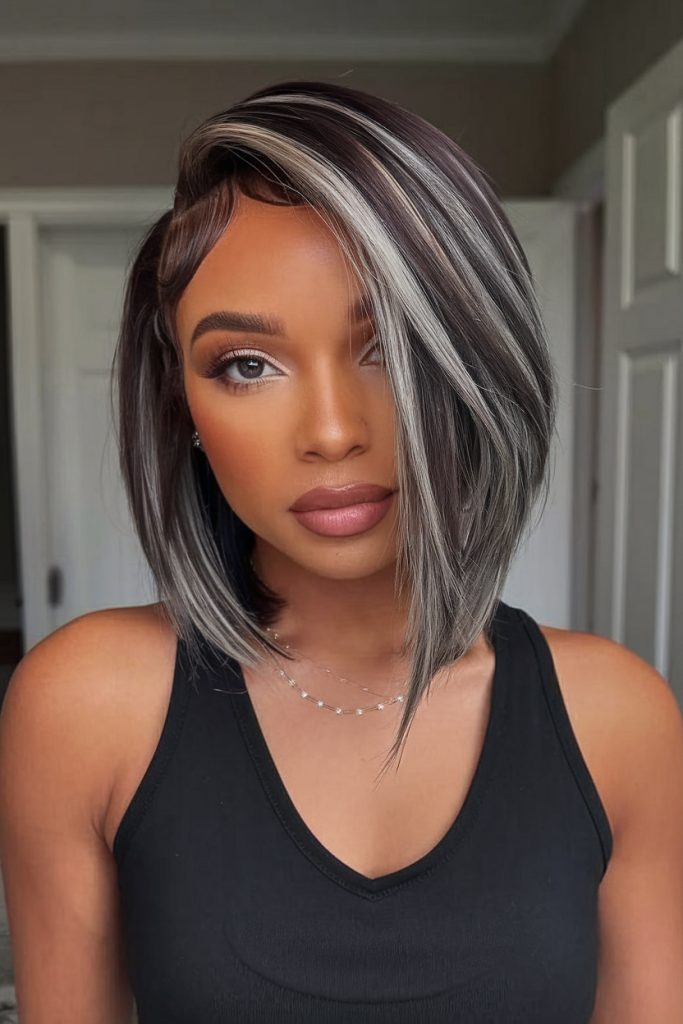 A structured bob in deep Brunette tones takes a futuristic turn with silver-blonde streaks. This is one of the most striking color trends for 2025 women who want bold contrast without going full platinum. The asymmetry of the cut sharpens the jawline, while the sleek texture keeps the look sophisticated. It’s a head-turning hairstyle ideal for both work and evening wear.