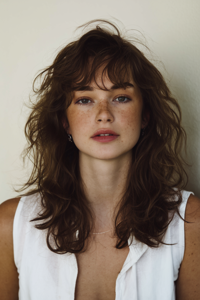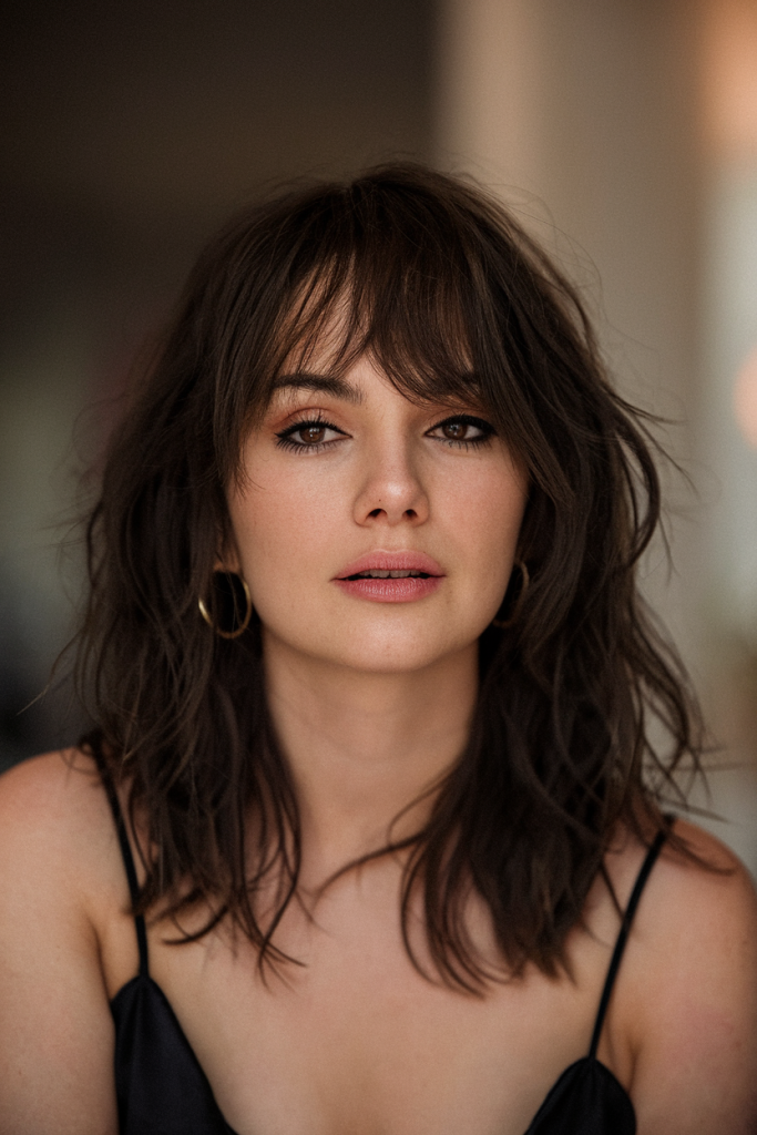 Equal parts intellectual and boho, this relaxed Brunette shag features soft eyelash-grazing bangs and effortless layers. It’s a smart update to the vintage shag—less rock-and-roll, more romance. Ideal for bookish souls or creative professionals looking for a style that carries personality.