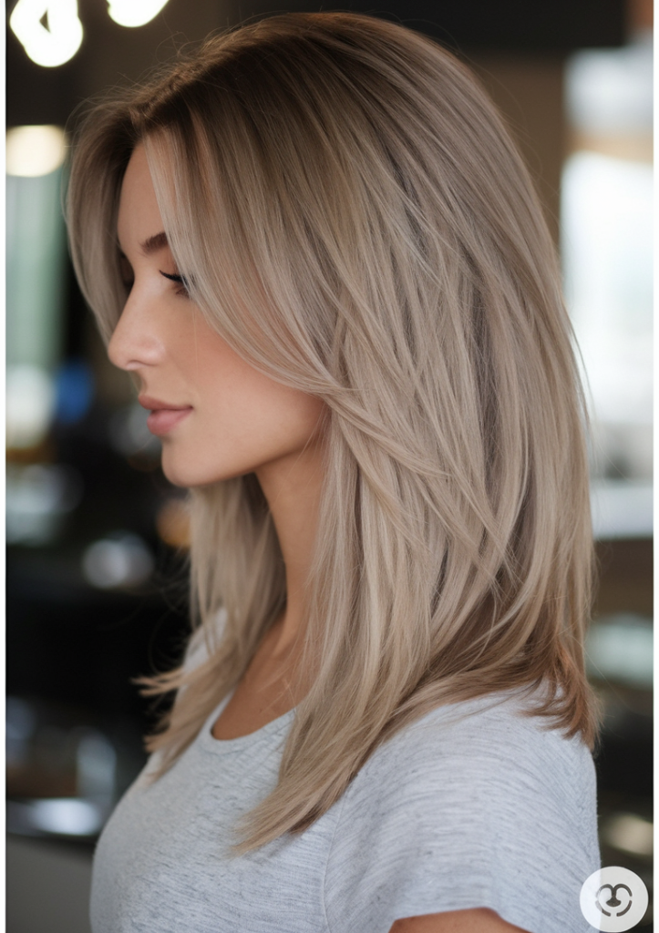 Soft yet dimensional, this tousled cut features long blonde layers with barely-there bangs that melt into the face-framing pieces. The texture is loose, airy, and romantic—perfect for a casual spring brunch or sun-drenched weekend getaway. This look feels carefree yet put-together, embodying that “rolled out of bed, still looks amazing” energy. It works best for women with natural waves or those willing to add a bit of curl with a wand for beachy separation.