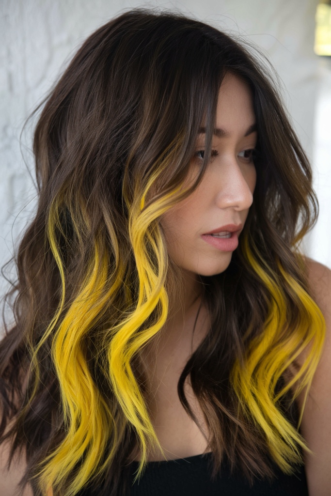This statement style screams creative confidence. With deep Brunette waves as the base, vivid yellow highlights frame the face for a high-impact “money piece” effect. It’s playful, fearless, and a major standout among colors 2025. Ideal for women who want to experiment with color while keeping their natural depth intact.
