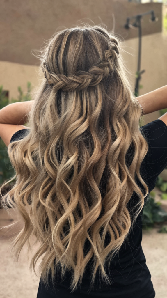Boho meets polished in this woven half-up crown braid. The styling technique allows you to showcase both texture and detail, making it a top pick for summer events or outdoor weddings. The blonde base color adds dimension to the braid, while the soft curls keep it light and feminine. This is festival-ready meets romantic muse.
