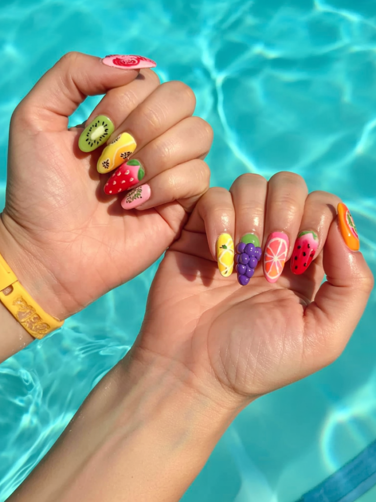 The colorful hand-painted finger art represents a fresh fruit mix that feels like a salad of tropical produce. This design collection combines hand-painted strawberries and kiwis with oranges, lemons and grapes to create bright nails perfect for a pool party. The gradient patterns and three-dimensional texture techniques create a fun and unique look that is authentic to the expressive cultural trends of 2025. The vibrant nails are perfect with light summer dresses or eye-catching swimwear, and the styling tip suggests finishing this set with citrus-themed accessories to enhance your fruity adventure.
