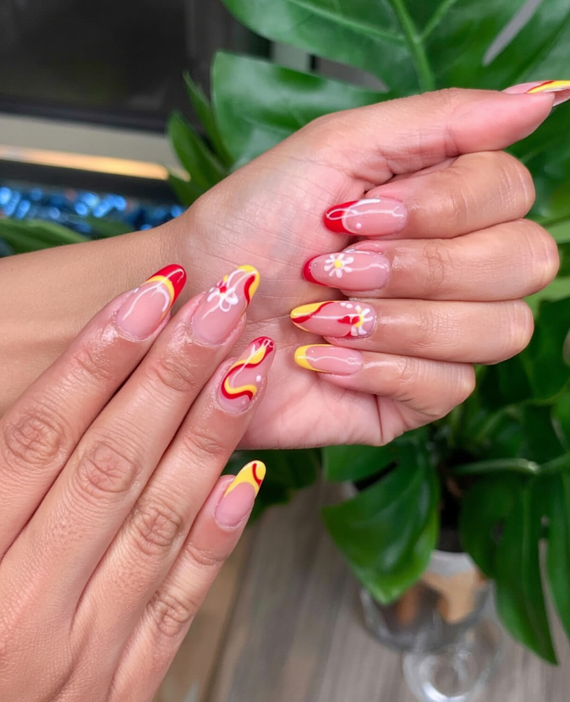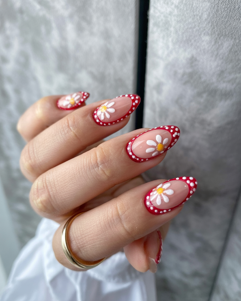 This design has a vintage appeal with its red polka dot French outlines combined with bold daisies. Almond nails have a contemporary feel with their retro style that makes them stand out as exceptionally fun. The combination of red accented polka dots with French outlines and bold daisies feels appropriate for events like summer fairs or weekend road trips when paired with red lips and cat eye sunglasses.