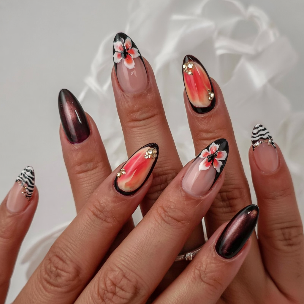 This design perfectly blends tropical love with imaginative design elements. Hibiscus flowers in coral and crimson hues are set within black borders to evoke the vibrant energy of tropical sunsets. Funky zebra prints along with gold embellishments create a fresh and unexpected combination for women who like their outfits to have a dramatic visual appeal. This design boasts a sophisticated look that is suitable for mixed use occasions, including both resort events and summertime drinks service. When wearing this nail design, choose either a black maxi dress or patterned caftan to match its intense and vibrant appearance.