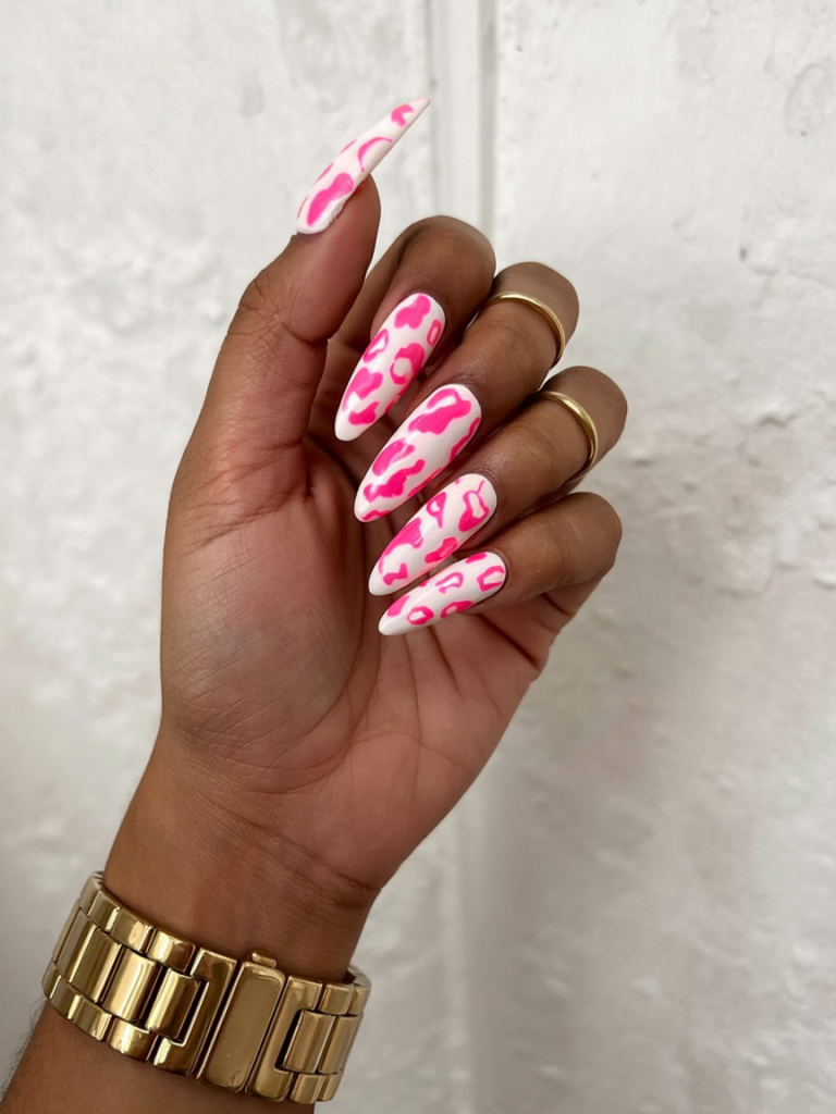 This adorable take on the leopard print combines delicate white areas with fresh pink spots for a contemporary matte finish. This pattern has an edgy look, yet remains both adorable and wearable, especially for trendsetting women who are not afraid to show off their untamed nature. The almond-shaped frame combines elegant design with the whimsical pattern to avoid anything too formal. Definitely a standout design for summer 2025.