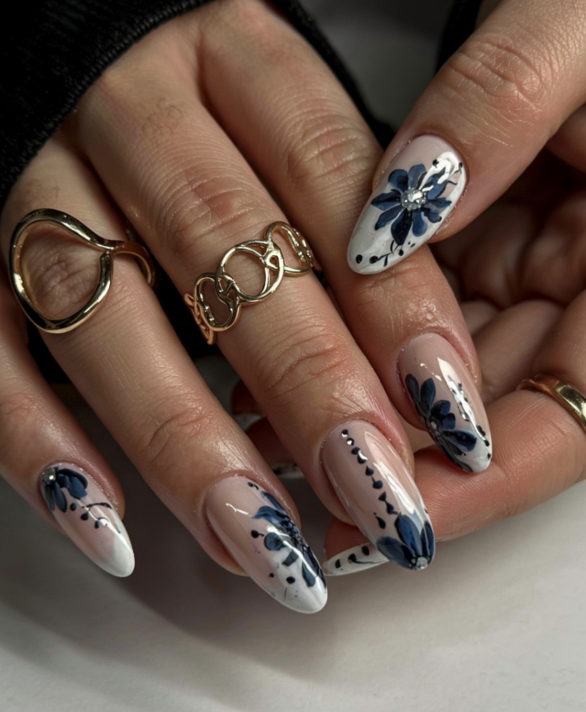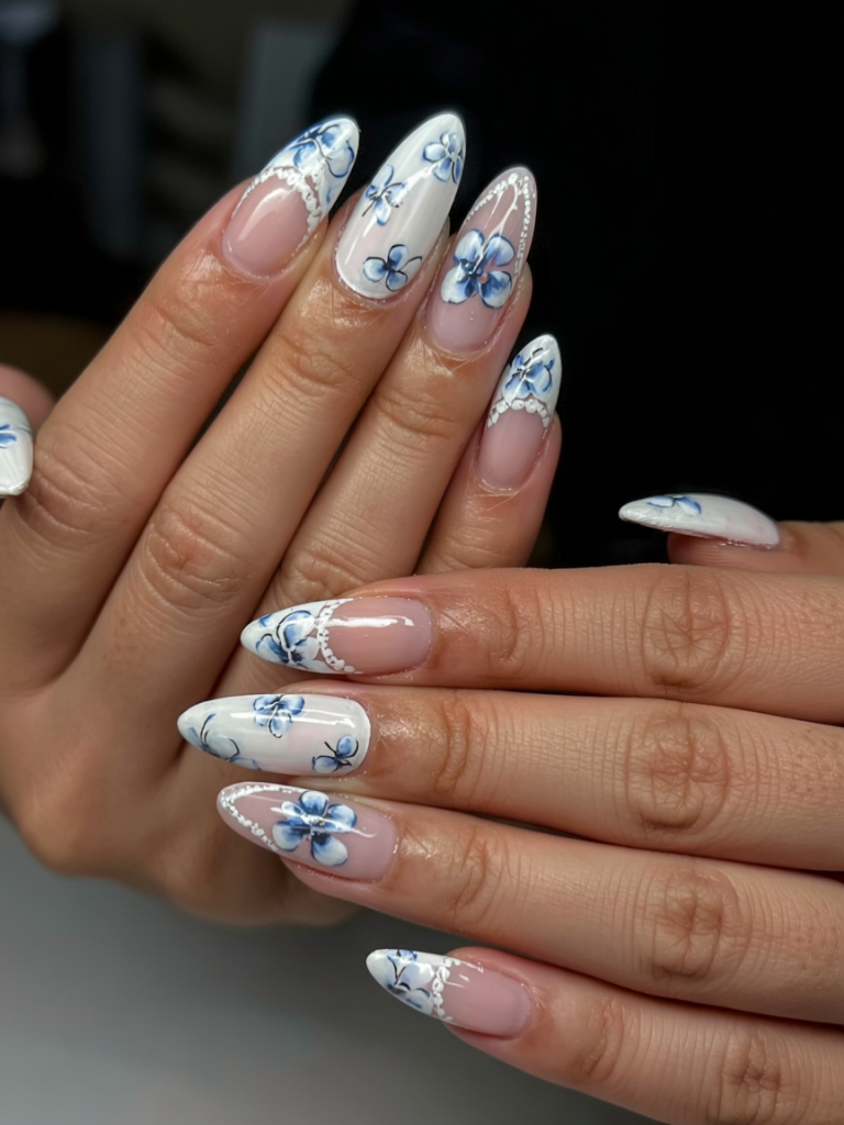 The intricate blue floral manicure based on porcelain art creates a sophisticated, stylish look. The manicure presents vintage glamour with its white base and delicate hand-painted floral designs that remain relevant to the fashion trends of 2025. These nails would shine at garden weddings and high tea events as they combine detailed decoration with romantic elegance, and the white dress with navy accents will cleverly copy these refined French elements.