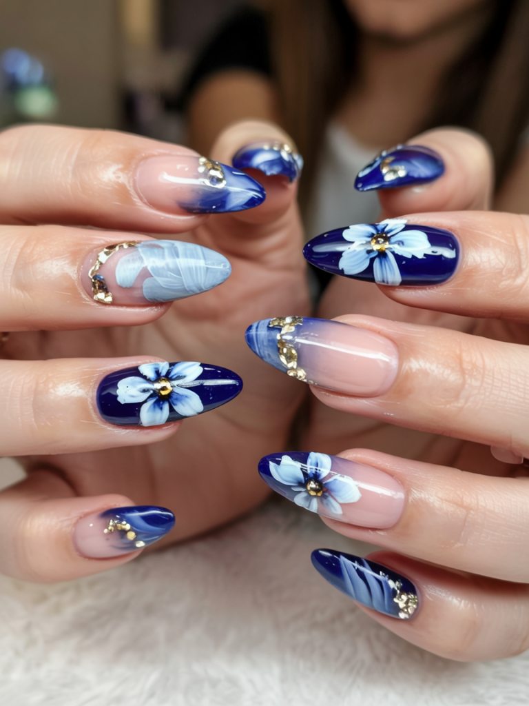 The outline of deep sapphire combined with white-blue flowers creates one of the most elegant gel nail sets in this roundup. The gold embellishments give this look an elegant, luxurious look that is suitable for formal occasions as well as evening events. This sophisticated design elevates floral nails to high fashion that anyone can wear as finger jewelry.