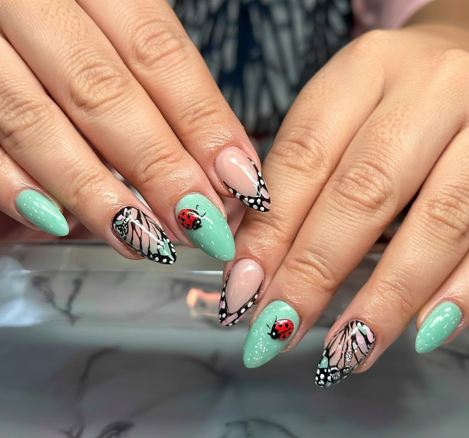This nature-themed set features butterfly wings and playful ladybugs against nude bases and mint green accents to create a fun look. This manicure effectively combines adorable and quirky elements, making it a great conversation starter for outdoor events such as summer barbecues or garden parties. The miniaturized perfection of the tiny insect elements plus wing details make this an exceptional nail art piece. The right styling tip is to pair it with floral print clothing or whimsical accessories for a complete enchanted garden look.