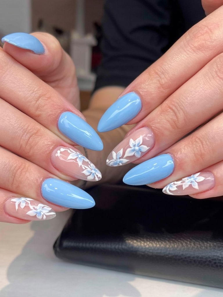 The nail set features baby blue almond nails that alternate between solid polish and delicate petal decorations, creating a serene, sophisticated and stylish look. This look achieves a soft statement appeal by combining white floral elements with sheer negative spacing while maintaining its fundamental connection to 2025 fashion trends. The recommended outfit for this style is summer clothing that includes loose blouses along with pastel sets for a cohesive monochromatic look.